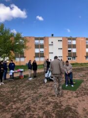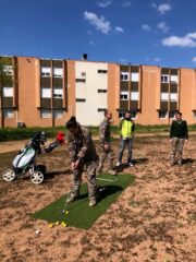 Installé sur le terrain de sport, en plein centre du quartier général, l’espace d’initiation proposait une approche accessible et sécurisée du golf. Par précaution, les participants se sont concentrés sur les petits coups d’approche, évitant ainsi l’utilisation du driver — une sage décision pour préserver les vitres environnantes ! Encadrés et conseillés, les volontaires ont pu découvrir les gestes de base, tester leur précision et, pour certains, révéler un intérêt inattendu pour cette discipline.